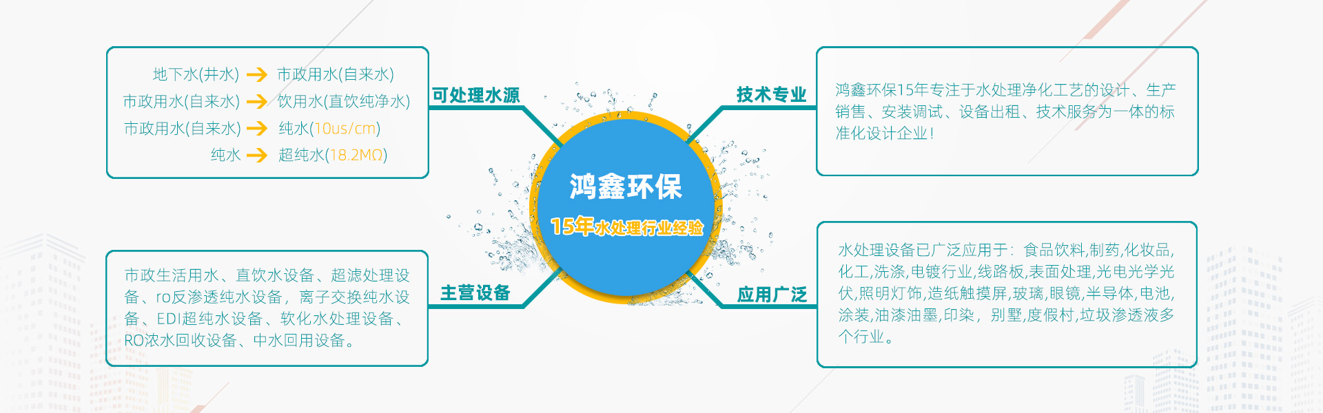 鴻鑫環(huán)保專業定制:市政生活用水處理設備、直飲純凈水設備超濾水處理設備、ro反滲透純水設備,離子交換純水設備、EDI超純水設備、軟化水處理設備、RO濃水回收設備、中水回用設備。